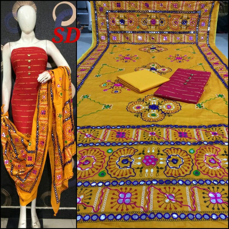 Suit piece with Dupatta Fine Cotton Top, Cotton Buttom, Cotton embroidery dupatta